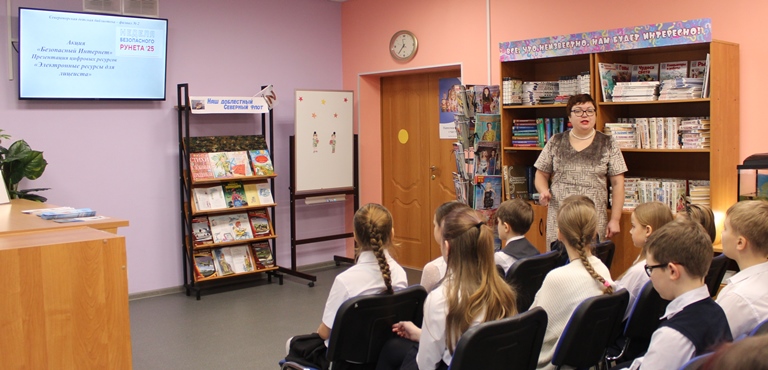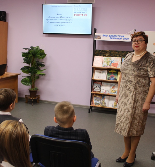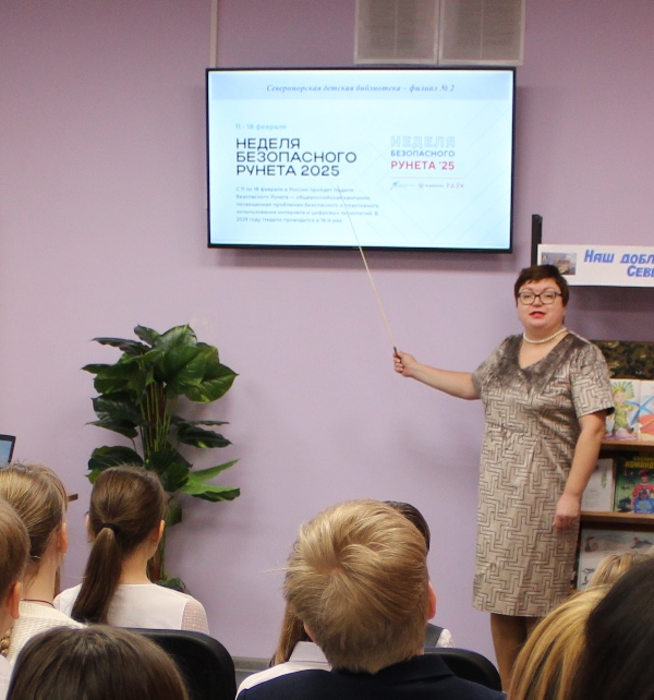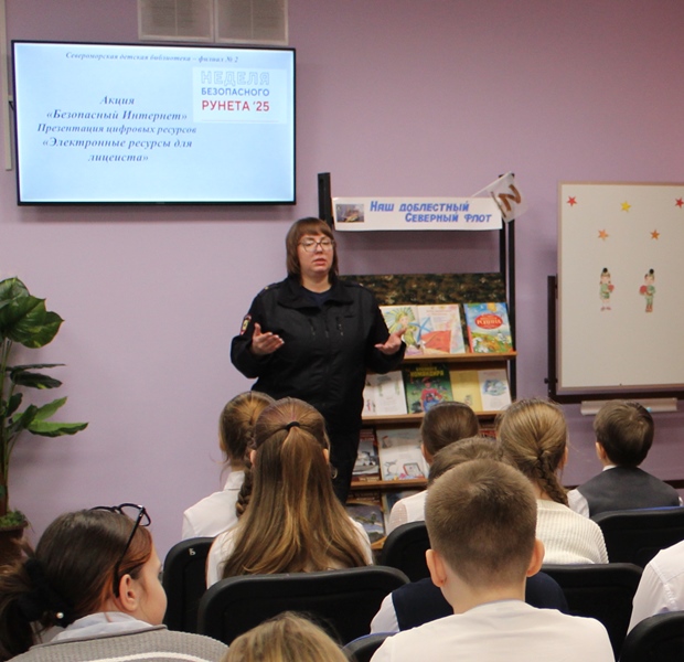 14 февраля 2025 года ученики 4А класса МБОУ ЗАТО город Североморск Лицей №1 присоединились к акции «Неделя безопасного Рунета», которая проводится в России с 11 по 18 февраля и посетили презентацию цифровых ресурсов «Электронные ресурсы для лицеиста» в Североморской детской библиотеке – филиале №2. Заведующая библиотекой Ларинина Лариса повторила с ребятами правилами безопасной работы в сети Интернет и обратила внимание школьников на сайт «Территория детства» ЦДБ им С. Михалкова МБУК Североморская ЦБС, где можно найти интересную информацию для самообразования. А также привлекла внимание юных читателей к просветительскому проекту «Цифровой ликбез», который помогает повысить цифровую грамотность и узнать больше о кибербезопасности в сети.