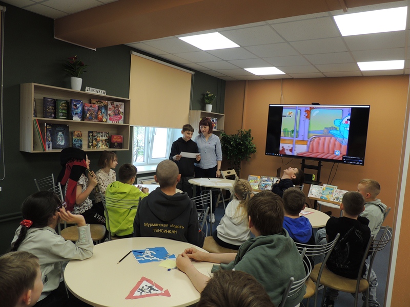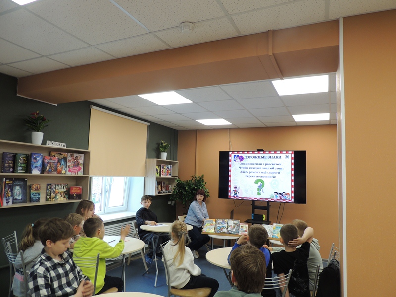 Мероприятие началось с рассказа библиотекаря о дорожных знаках. Дети узнали, что знаки бывают предупреждающие, запрещающие, информационно-указательные и знаки сервиса.