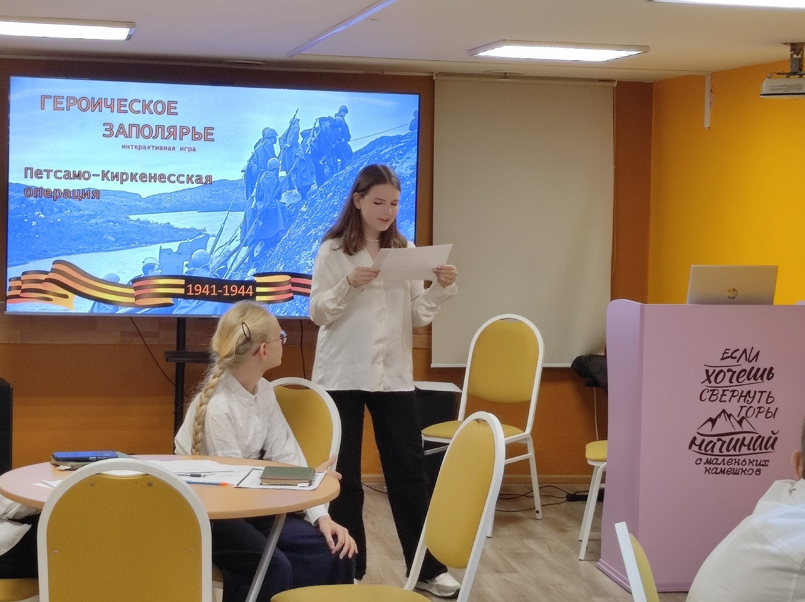 13 октября в Центральной детской библиотеке имени С.Михалкова прошла интерактивная игра «Героическое Заполярье», посвященная Петсамо-Киркенесской операции.В рамках увлекательной игры  участники погрузились в события Петсамо-Киркенесской операции, которая стала важной вехой в истории Второй мировой войны. Своими знаниями  с гостями поделился автор игры и куратор мероприятия – Роман Фесенко, заведующий отделом обслуживания библиотеки-филиала  №24  г. Мурманска.