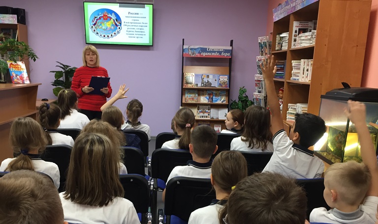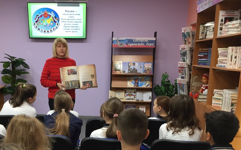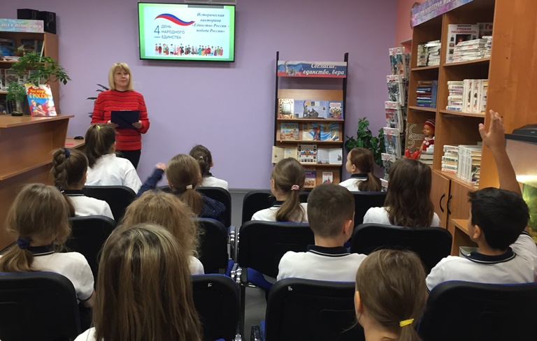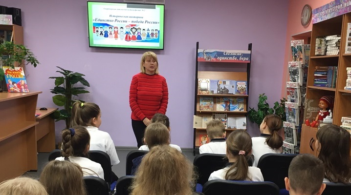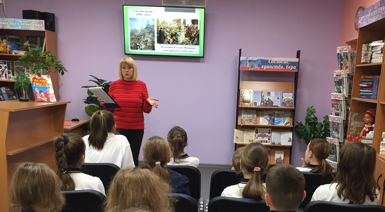 Рассказ библиотекаря 1 категории Оксаны Степановой затрагивал знаменитые страницы истории России. Дети вспоминали подвиг полководцев Кузьмы Минина и Дмитрия Пожарского, а также события смутного времени. В заключении мероприятия ребята познакомились с литературными источниками и зачитали пословицы и поговорки о Родине.