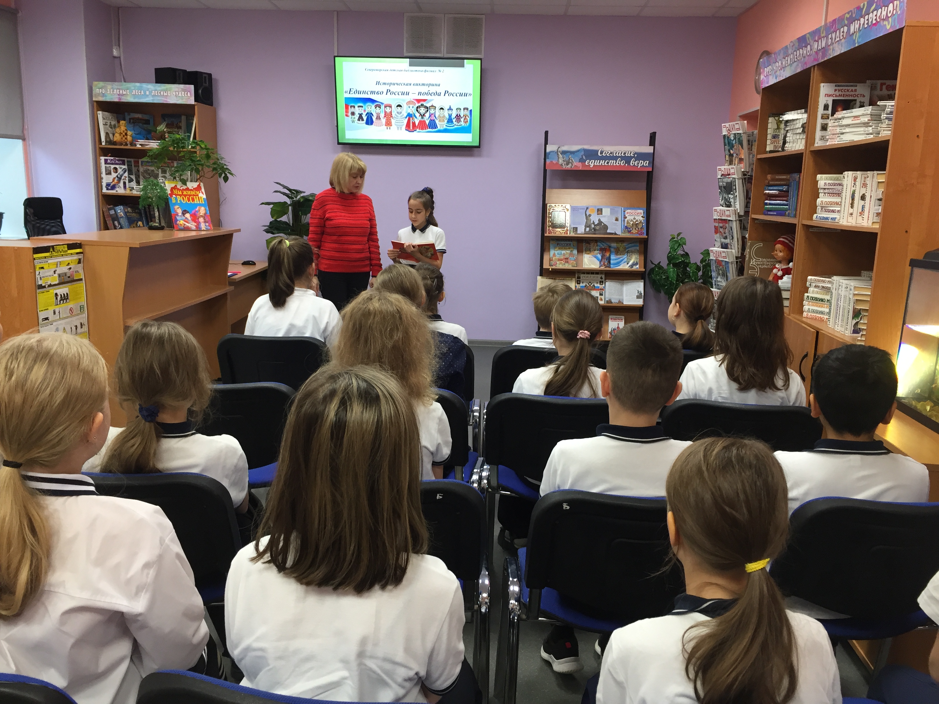 01 ноября 2025  года ученики 3 А класса МБОУ ЗАТО город Североморск Лицей №1 посетили Североморскую детскую библиотеку – филиал №2, чтобы принять участие в исторической викторине  «Единство России – победа России», посвященной Дню народного единства.