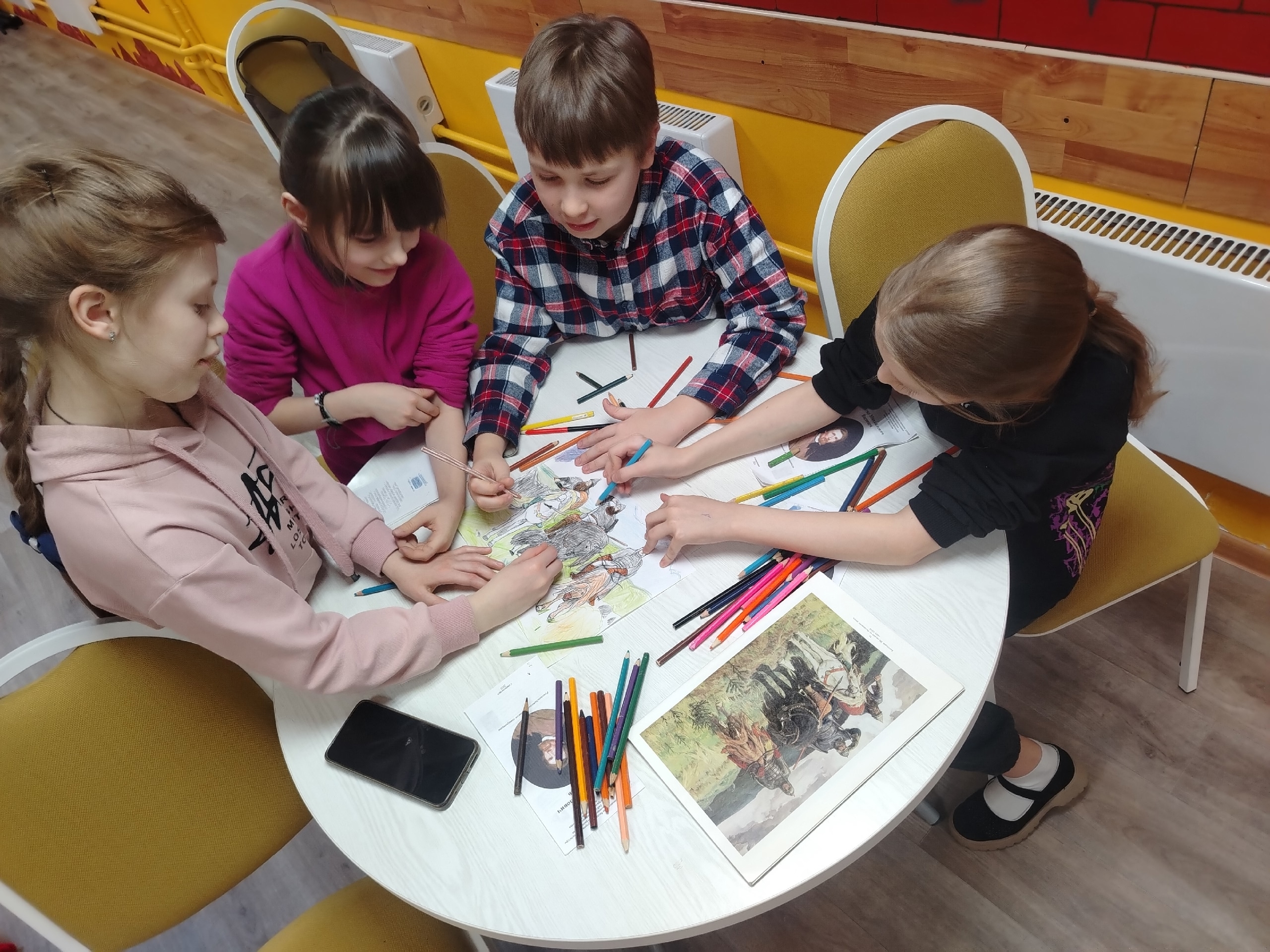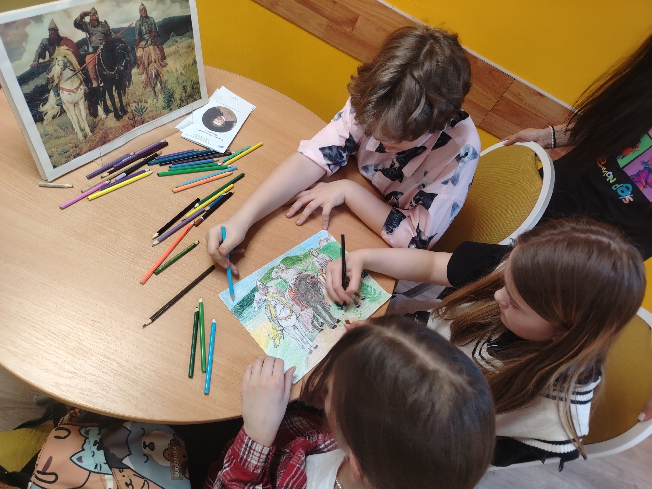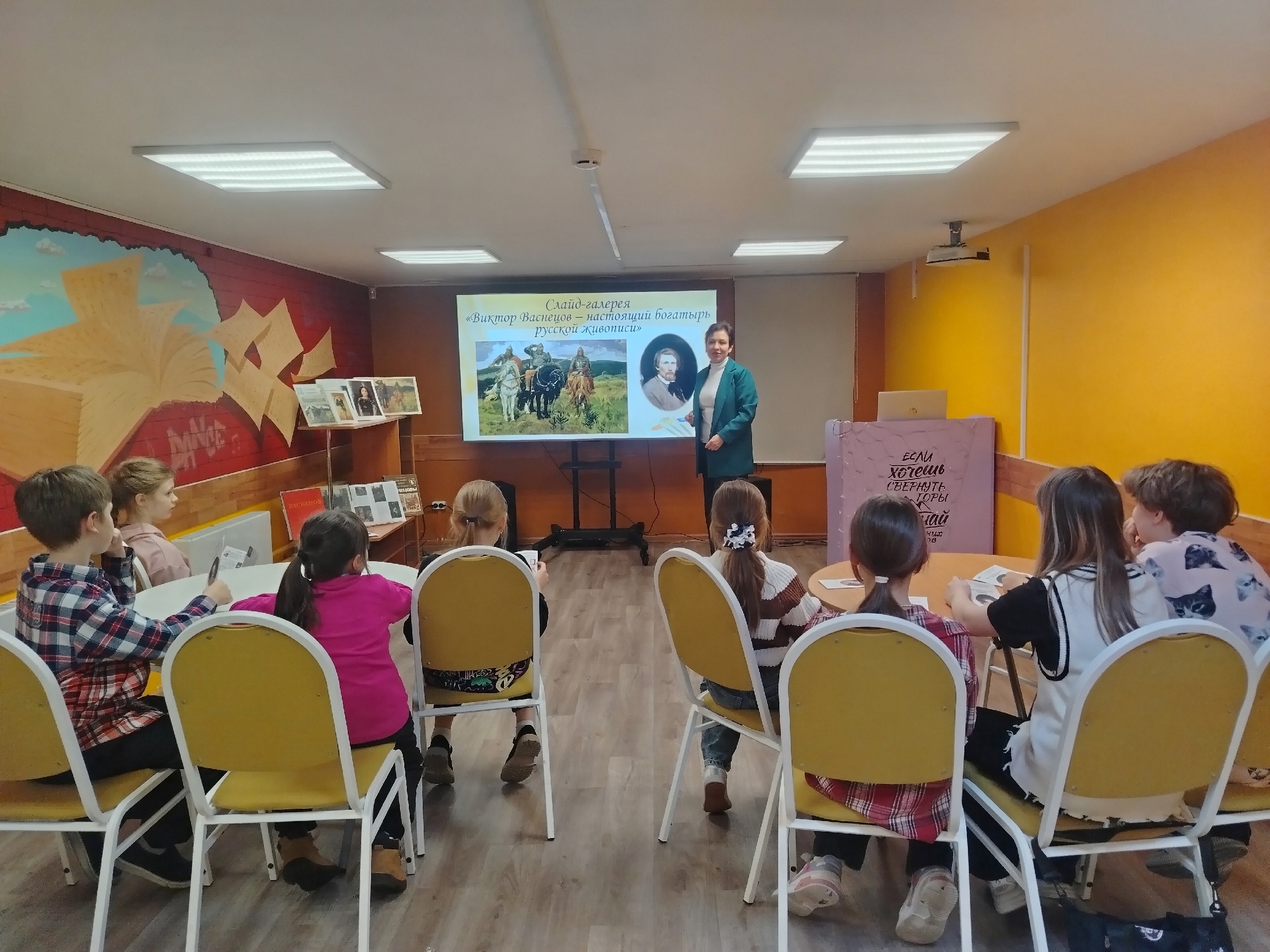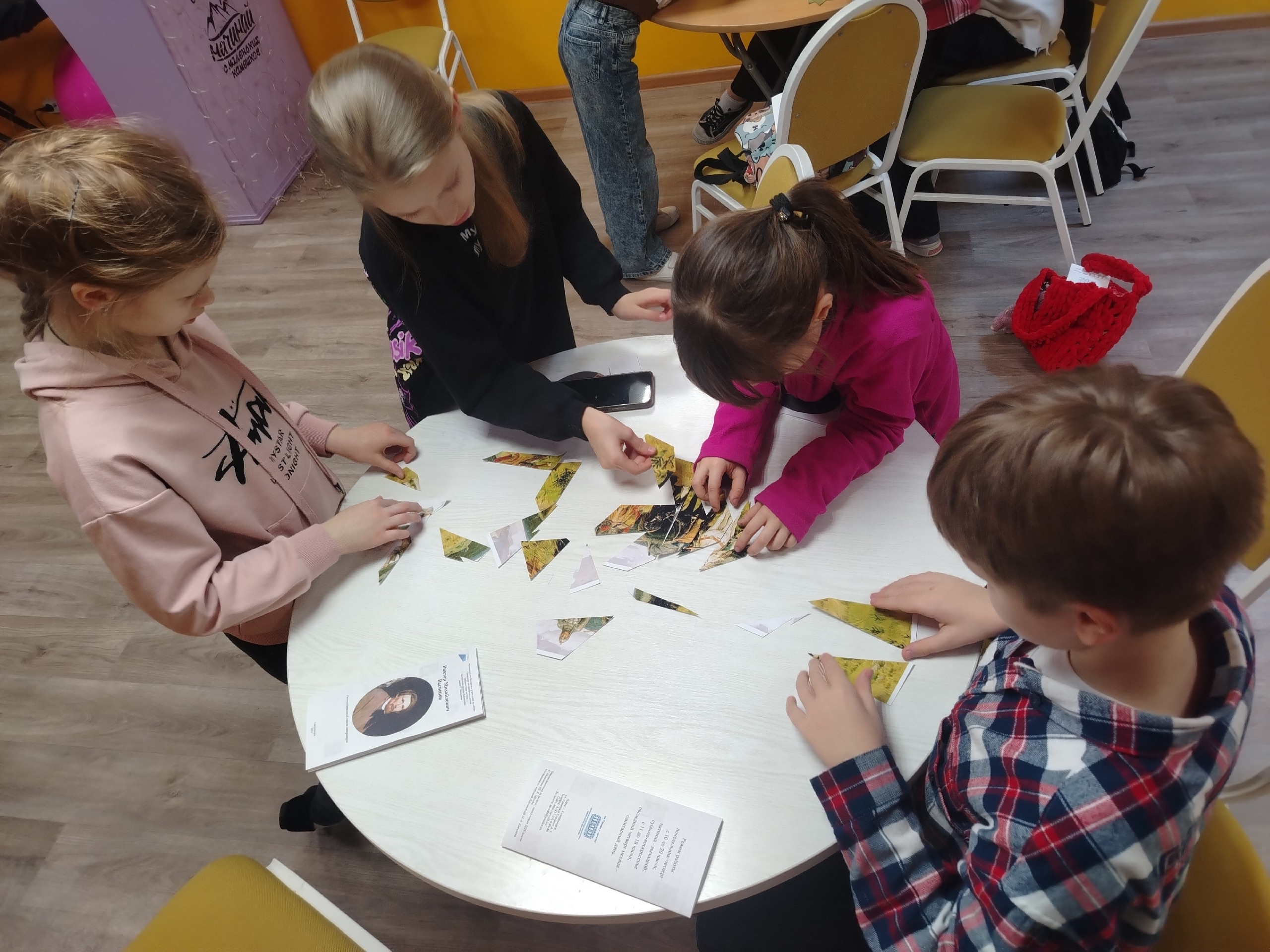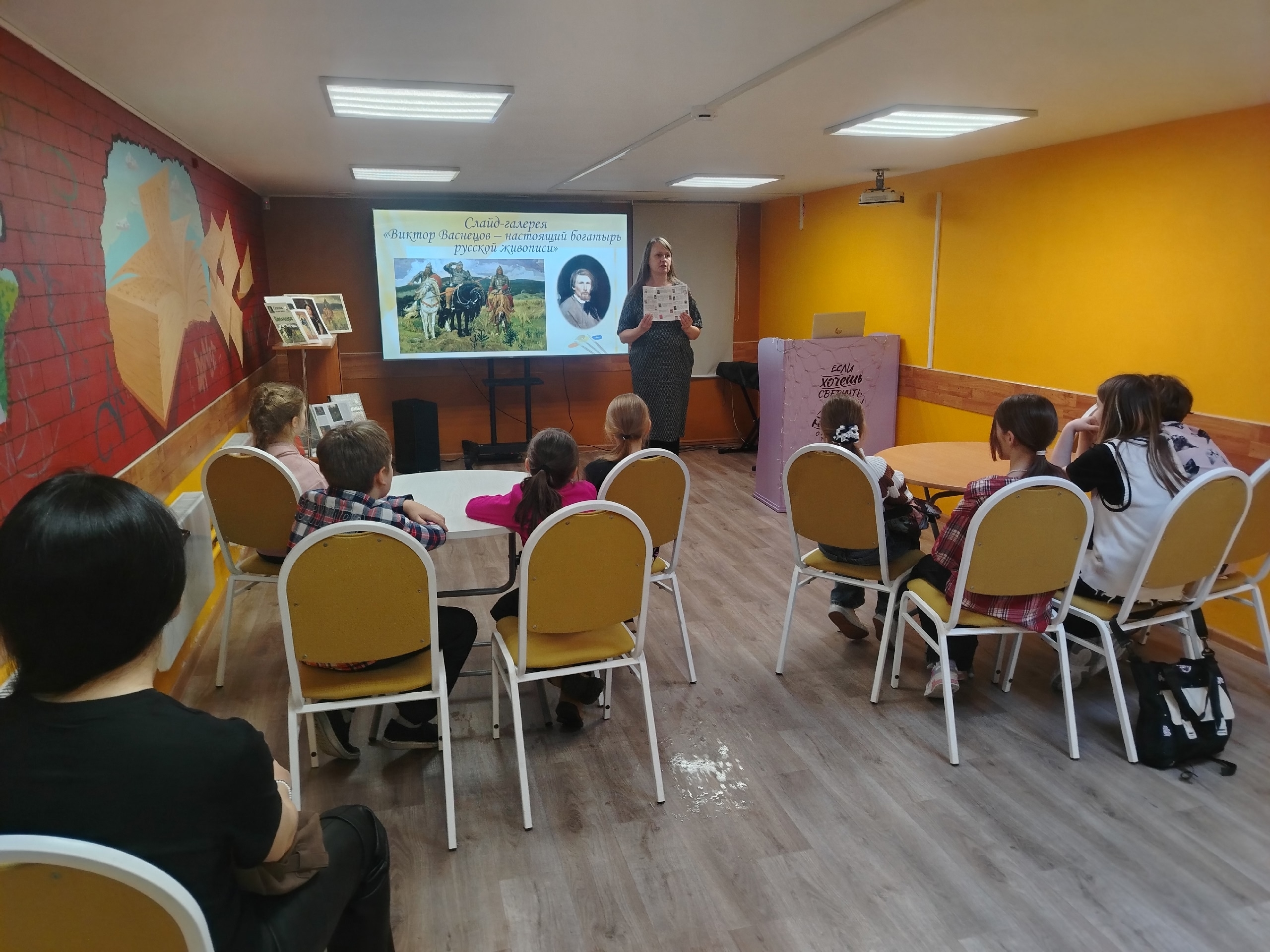 Ребята познакомились с биографией живописца и узнали много нового и интересного о его картинах. Затем участники встречи ответили на вопросы викторины “Сказочное путешествие по картинам Виктора Васнецова”, собрали пазлы и получили буклеты со списком книг о творчестве художника.