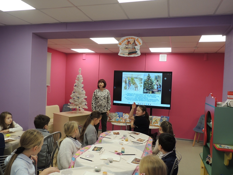 На мероприятии ребята познакомились с историей, традициями и обычаями украшения новогодних елок. Библиотекарь Любовь Юрьевна рассказала, как елочные игрушки на протяжение столетий меняли форму и сюжеты, из каких материалов создавались праздничные украшения.