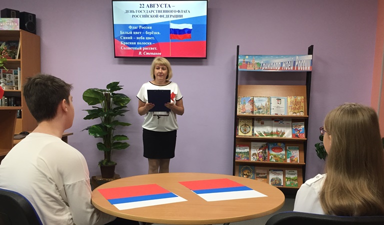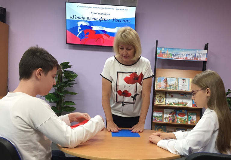 20 августа 2025 года в Североморской детской библиотеке–филиале №2  для читателей микрорайона Авиагородок состоялся  урок истории «Гордо реет флаг России», приуроченный ко Дню Государственного флага Российской Федерации.Библиотекарь 1 категории  Оксана Степанова подготовила красочную презентацию и проникновенный рассказ, которые  помогли понять ребятам историю создания государственных символов России и их значение в жизни каждого гражданина.