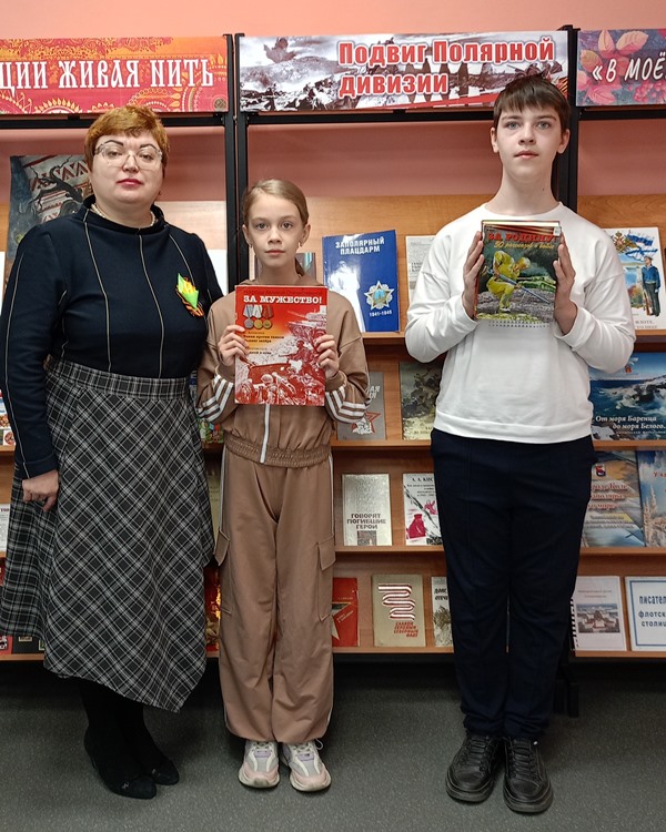 Заведующая библиотекой Ларинина Лариса рассказала о тяжелом и героическом периоде обороны Заполярья от фашистских захватчиков и предложила ребятам высказать свое мнение о том, что значит быть героем своей страны. Дети, посещающие библиотеку, отвечали, что важно любить свою Родину, защищать ее границы – и это долг настоящего гражданина. В заключение мероприятия школьники познакомились с книгами по теме.
