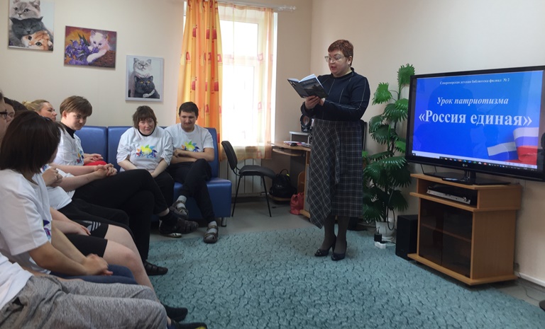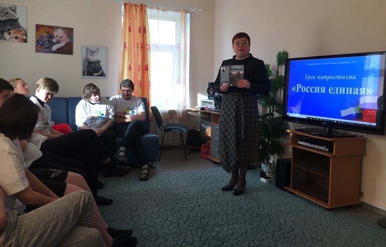30 сентября 2025 года библиотекарь 1 категории Оксана Степанова и заведующая Североморской детской библиотекой – филиалом №2 Ларинина Лариса посетили отделение дневного пребывания Молодых инвалидов Комплексного центра социального обслуживания населения ЗАТО г. Североморск, чтобы организовать урок патриотизма «Россия единая». Оксана Степанова рассказала подросткам о том, что 30 сентября 2022 года президент РФ Владимир Путин в Кремле подписал с главами ДНР, ЛНР, Запорожской и Херсонской областей договоры о включении этих территорий в состав Российской Федерации на правах субъектов. Так как жители этих четырех регионов сделали свой однозначный выбор и навсегда стали гражданами России. Ларинина Лариса познакомила ребят с книгами, прочла стихотворения по теме мероприятия и сообщила, что наша страна продолжает делать все, чтобы русские люди чувствовали поддержку, ощущали единство и сохраняли свой язык и веру.