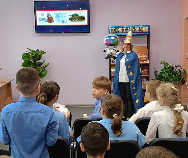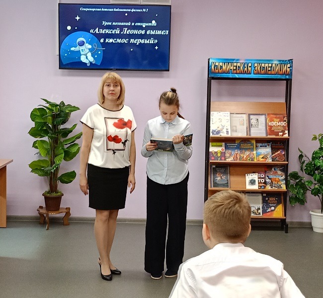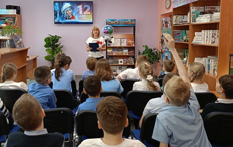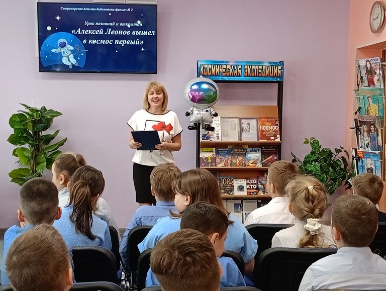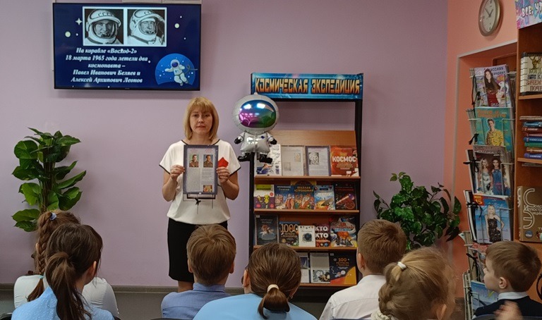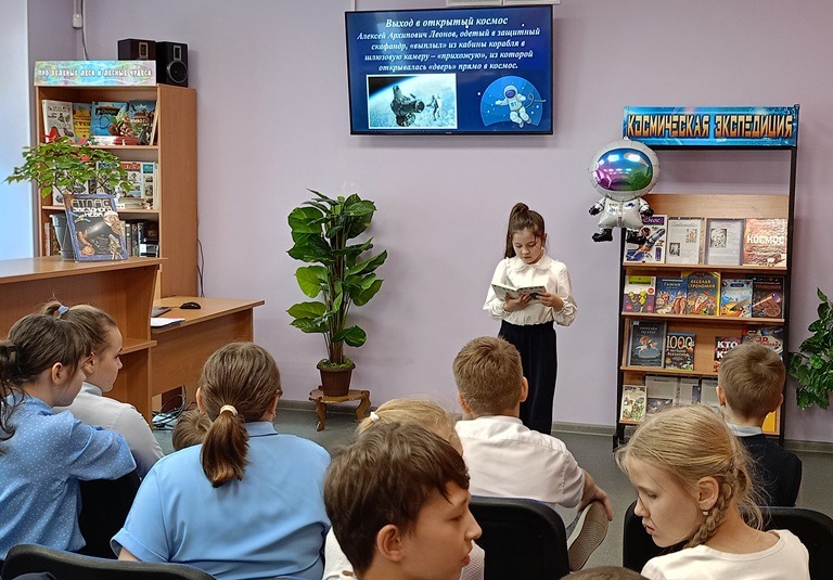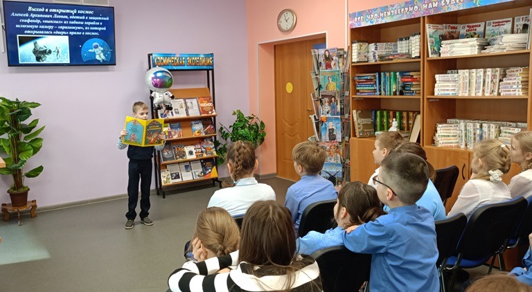10 апреля 2025 года ученики групп продленного дня 3Б и 3В классов МБОУ ЗАТО город Североморск Лицей №1 посетили Североморскую детскую библиотеку – филиал №2, чтобы принять участие в уроке познаний и открытий «Алексей Леонов вышел в космос первым». Библиотекарь 1 категории Оксана Степанова рассказала о биографии космического первопроходца Алексея Архиповича Леонова, а библиотекарь 2 категории Алина Яценко в образе Звездочета пригласила юных читателей совершить занимательное путешествие по планетам Солнечной системы, а также ответить на вопросы викторины. Интересные загадки и познавательные книги, помогли лицеистам узнать много о космическом пространстве Земли.